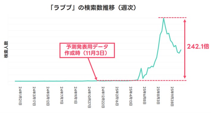 LINEヤフーでは2022年末から次の年に流行することが期待される商品や事象を予測・解説したヒット予測レポートを公開しています。昨年発表したレポートでは、ぬいぐるみの「ラブブ」がもっとも関心を集めたとのことです。ヒット予測モデルが予測した時点の検索数と比較して、最大で約240倍も増加するほどの上昇を見せるなど、ヒット予測モデルの可能性を改めて感じさせる結果となったようです。