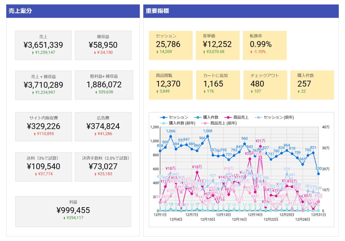 システム上では前日までの数値が一目でわかるだけでなく、昨年対比も表示できるため、「売上」だけでなく「セッション」「客単価」「転換率」といった重要な指標のどこが上昇または下降しているのかを即座に確認することができます。さらに、どの数値をどのように取得すべきか分からないというユーザー向けには、ヒアリングから実際の設定まで行うオプションサービスも用意されているとのことです。