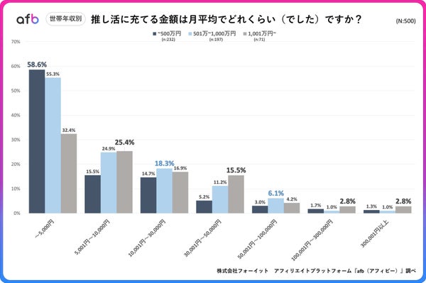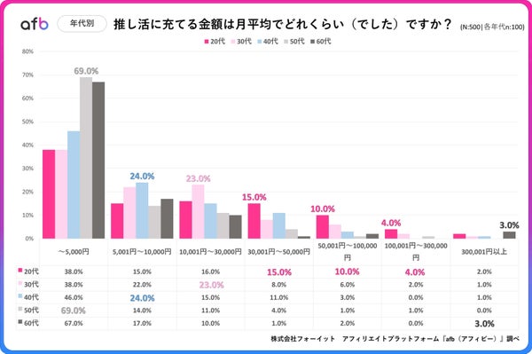 アフィリエイトプラットフォーム「afb(アフィビー)」を提供する株式会社フォーイットが、全国の20代から60代の男女500人を対象に推し活に関する実態調査を実施し、その結果をまとめられました。調査では推し活にかける月平均の支出額について詳細な分析が行われています。