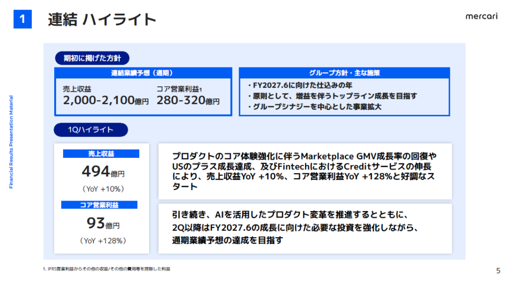あわせて、メルカリは2027年6月期を見据えた中期方針として掲げている「売上収益の年平均成長率2桁成長」「コア営業利益の年平均成長率25%以上」という目標を維持しつつ、今後もプロダクトのコア体験強化と成長投資を進める方針です。