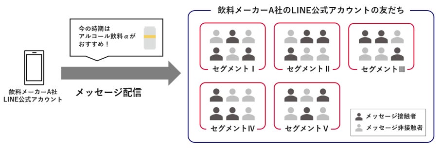 飲料メーカーA社のアルコール飲料αのプロモーションにおいて、本サービスが活用されました。A社のLINE公式アカウントの友だちをⅠ~Ⅴの5つのセグメントに分け、それぞれに対してメッセージを配信。その後、配信効果をPontaの購買データを用いて分析しています。