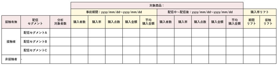 同社が広告主企業に提供するデータを活用することで、配信接触者と非接触者の「配信前後」における購買行動を比較できます。また、同一プロモーションにおいて異なるセグメントに配信した場合、それぞれの購買効果の比較も実現できます。