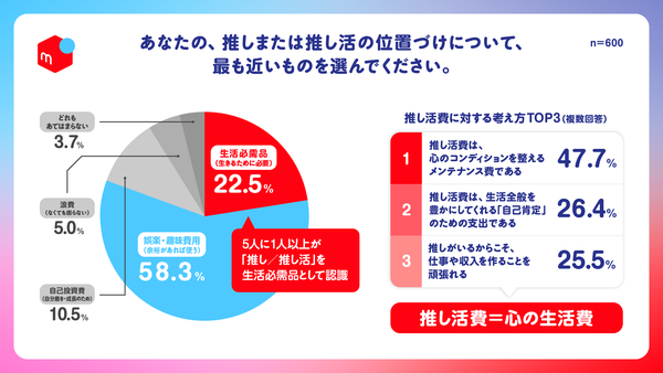 このように生活の一部となりつつある「推し/推し活」の位置づけについて尋ねると、5人に1人以上(22.5%)が「生活必需品(生きるために必要)」と回答しています。また、推し活費に対する考え方としては、「心のコンディションを整えるメンテナンス費(47.7%)」が最多となり、次いで、「生活全般を豊かにしてくれる『自己肯定』のための支出(26.4%)」「推しがいるからこそ、仕事や収入を作ることを頑張れる(25.5%)」が続きました。これらの結果から、推し活費は単なる趣味・娯楽費ではなく、日々の生活を精神的に支え、自分らしさを保つための必要経費、いわば「心の生活費」として捉えられている実態が明らかになっています。