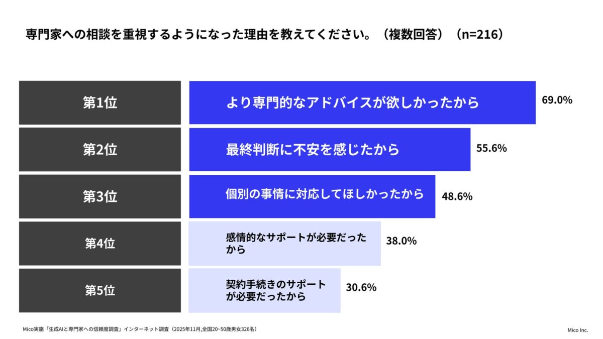一方で、専門家への相談を重視するようになった理由の上位は、「より専門的なアドバイスが欲しかったから」(69.0%)、「最終判断に不安を感じたから」(55.6%)、「個別の事情に対応してほしかったから」(48.6%)、「感情的なサポートが必要だったから」(38.0%)となっています。専門家には判断支援や、個別に寄り添う対応が期待されていることが明らかになりました。