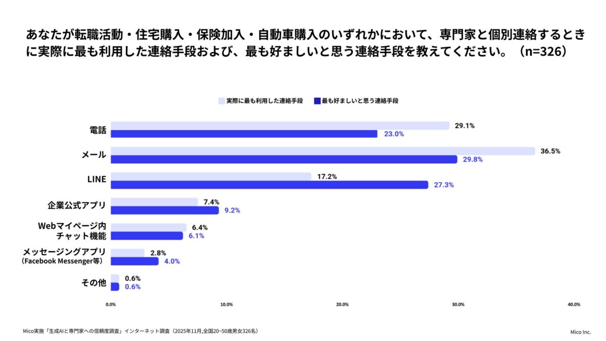 専門家との個別連絡において、最も好ましいチャネルは「メール」(29.8%)、「電話」(23.0%)、「LINE」(27.3%)の順となりました。特に「LINE」は実際に企業が活用している連絡手段との差が最も大きい結果となり、潜在的な利用ニーズが高いことが示されました。