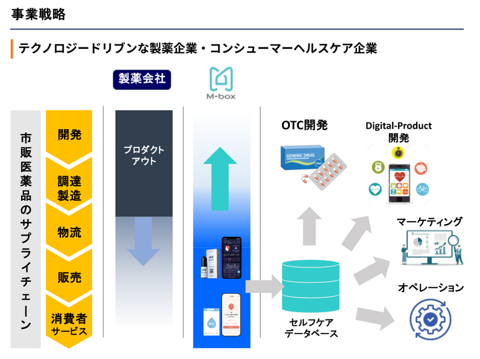 「市販薬とアプリを併用したセルフケア支援サービス」を事業の中核として、単に薬を販売するのではなく、アプリが薬の選択から使用後の効果確認までをサポートし、利用体験全体を高める仕組みを備えています。薬とアプリを連携させることで、“使って終わり”ではなく、継続的で効果的なセルフケア体験を提供しているのです。