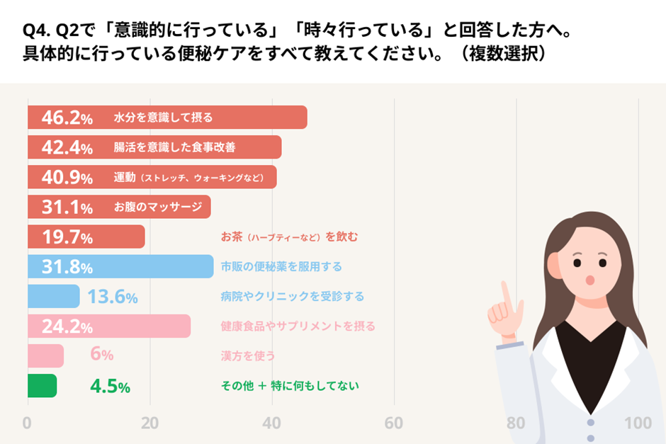 ・便秘対策の中心は「水分摂取」「食事改善」「運動」など生活習慣による”自然派”が大半を占め、市販薬の便秘薬を使用する人は全体の約3割にとどまっている