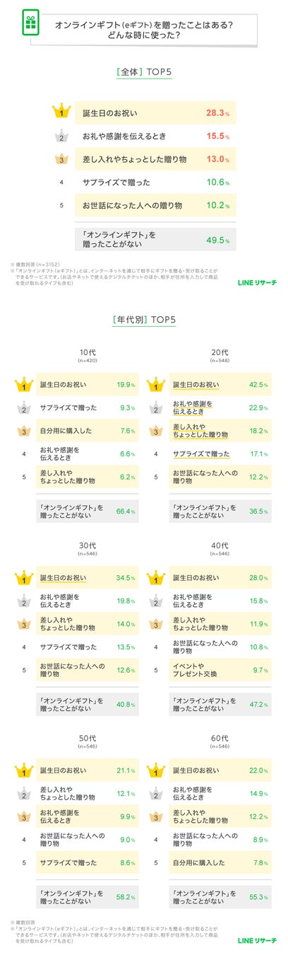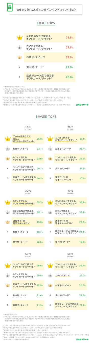 【調査結果】オンラインギフト(eギフト)贈答経験は約5割、もらって嬉しいのは「コンビニ」「カフェ」のギフトカード―LINEリサーチ調べ