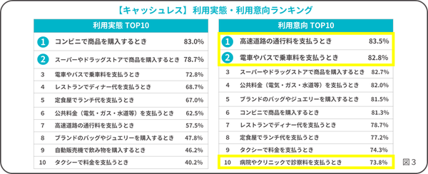 - <キャッシュレス>利用実態・利用意向ランキング!「どちらも使える場合の利用意向」1位と2位は「交通手段への支払い」