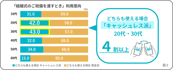 特に「結婚式のご祝儀を渡すとき」において、どちらも使える場合の利用意向で「キャッシュレス派」は40代32.0%、50代34.0%、60代15.0%である一方、20代42.0%、30代43.0%と、若い世代で「キャッシュレス派」の比率が高くなっていることが判明しています。近年では事前振込型のご祝儀も登場しており、若い世代を中心に冠婚葬祭シーンでも「キャッシュレス派」が今後伸びていく可能性があるようです。