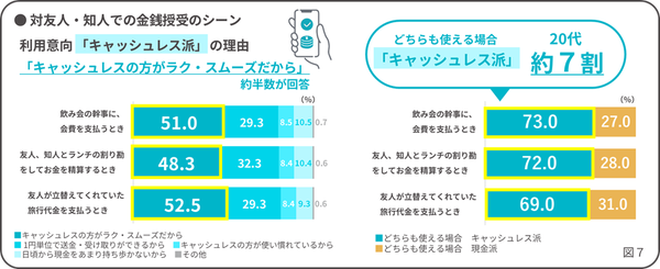 20代では、現金・キャッシュレスどちらも使える場合に「キャッシュレス派」を選ぶ人の割合は、「飲み会の幹事に、会費を支払うとき」73.0%、「友人、知人とランチの割り勘をしてお金を精算するとき」72.0%、「友人が立て替えてくれていた旅行代金を支払うとき」69.0%と、他世代よりも友人や知人との金銭授受のシーンにおいてキャッシュレス利用を望む人が多いことが明らかになっています。