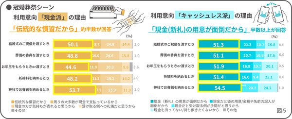 - 冠婚葬祭シーンにおいて、「現金派」の理由は「伝統的な慣習」がトップ。「キャッシュレス派」の理由は「現金の用意が面倒だから」がトップに。