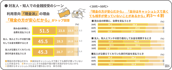 現金・キャッシュレスどちらも使える場合に、友人や知人など対人間での金銭授受のシーンにおいて「現金派」と回答した理由として、「現金の方が安心だから」がトップとなっています。