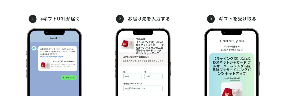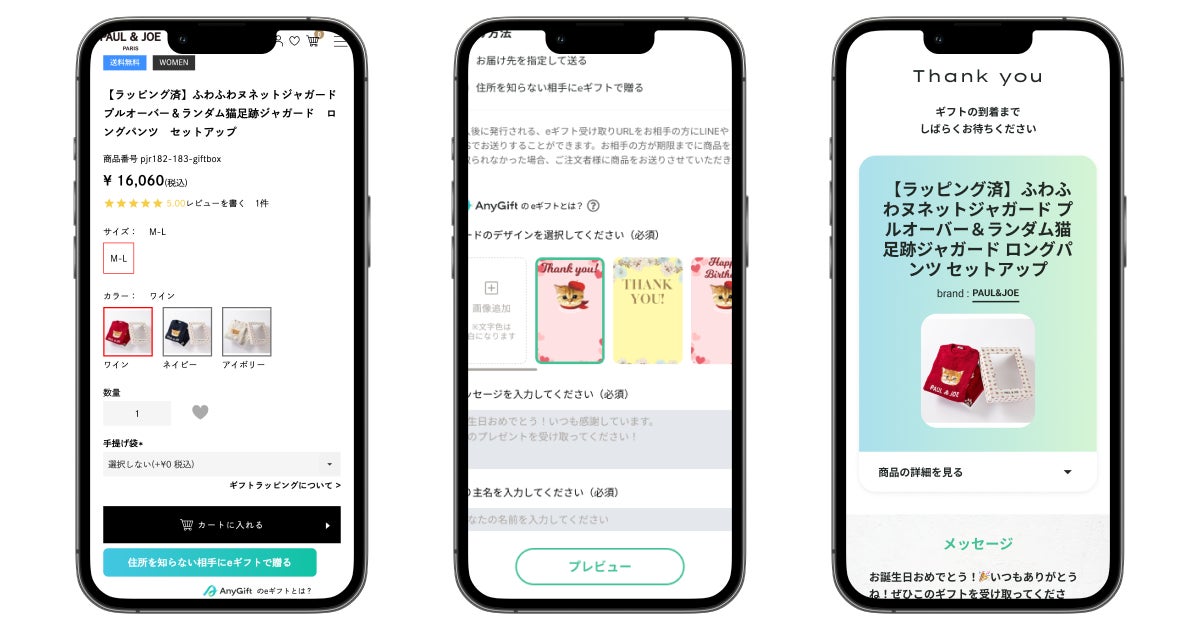 AnyGiftは、受け取り相手の住所情報がなくてもLINEやメールを通じて贈ることができる「eギフト機能」をECサイトに組み込むことが可能なサービスです。この機能の導入により、「PAUL & JOEルームウェア公式サイト」の人気商品がeギフトとして手軽に贈れるようになりました。