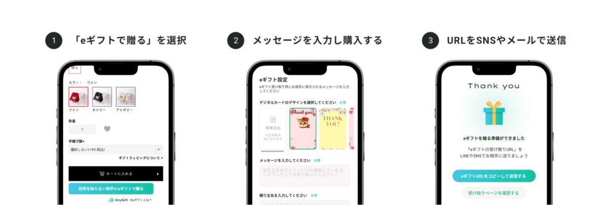 『AnyGift(エニーギフト)』は、受け取り相手の住所情報がなくてもLINEやメールで贈ることができる"eギフト機能"を、自社ECサイトに組み込み・導入できるサービスです。