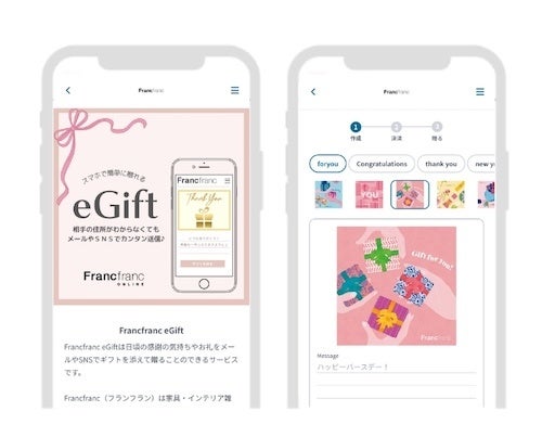Francfrancでは、ギフト需要のさらなる開拓と自社ECでの流通拡大を目的に、新たな取り組みとして「eGift System」サービスを導入し、「Francfranc eGift」の発行および販売をスタートさせたことが発表されています。「Francfranc eGift」はFrancfranc(フランフラン)オンラインショップでのお買い物に利用できるeギフトであり、1,000円から10,000円までの4種類の金額設定が用意されているとのことです。