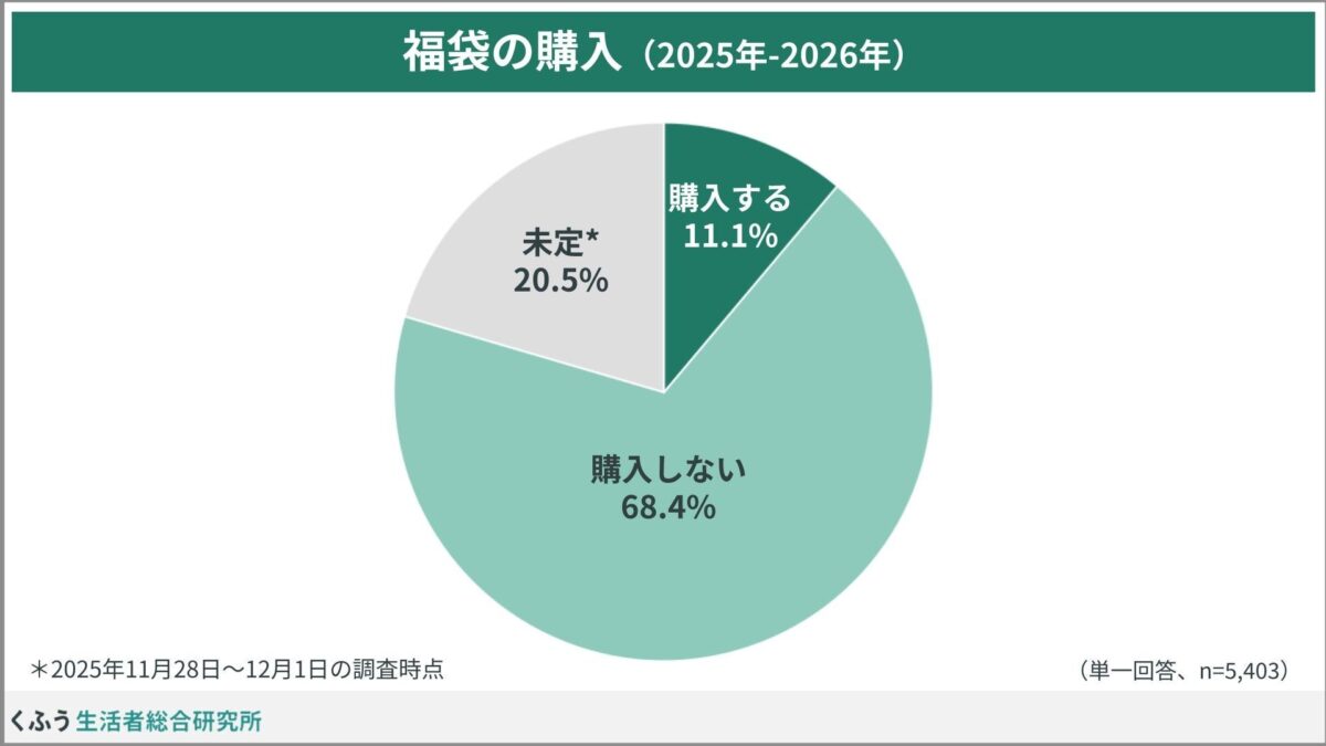 調査が行われた2025年11月末から12月初めの時点で、福袋を既に「購入する」と決めている人(購入済みを含む)は約1割、これから検討するという「未定」の回答者は約2割となっているそうです。