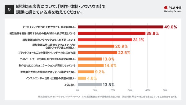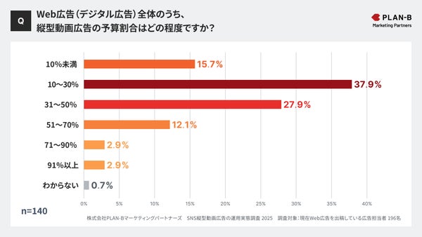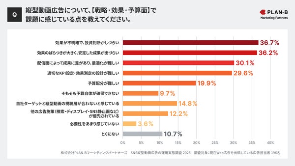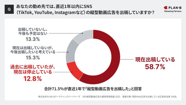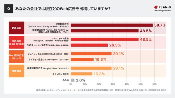 Web広告・SEOなどのデジタルマーケティング支援を行う株式会社PLAN-Bマーケティングパートナーズ(東京都品川区、代表取締役:鳥居本 真徳)が、全国のWeb広告担当者196名を対象に「SNS縦型動画広告の運用実態調査」を実施しました。