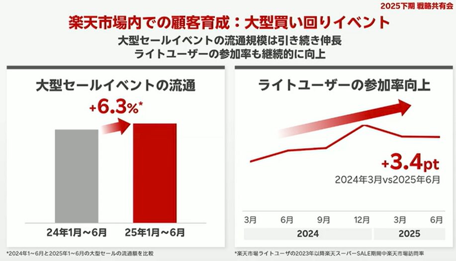 2025年7月30日に開催された楽天市場の下半期戦略共有会では、大型セールイベントの流通額が前年同期比で+6.3%と、堅調に伸びていることが示されました。加えて、母の日や父の日といったシーズナルイベントの流通額も、国内EC全体の成長率を上回る水準で推移しています。