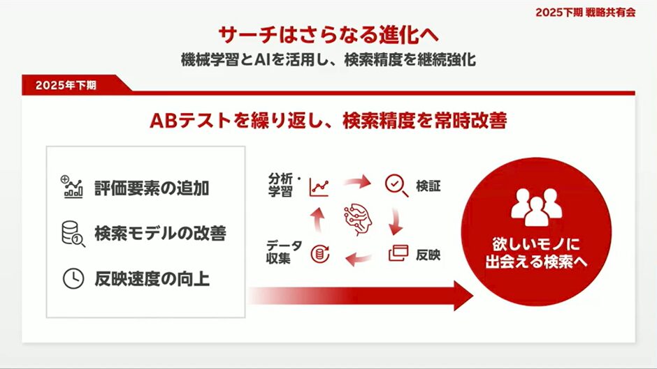 パーソナライズド検索の実装により、検索経由の流通額は一定の伸びを示しましたが、その影響はまだ限定的です。楽天は今後、LLM(大規模言語モデル)を活用した検索・提案の高度化を進めるとしています。これは、キーワード中心だった検索行動が、「目的や文脈」を含んだ形に変化することを意味します。