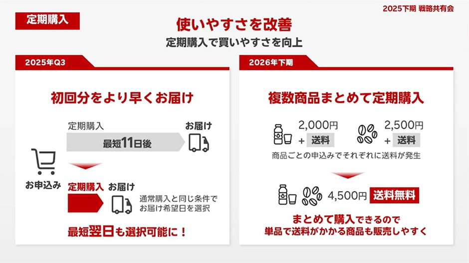 2026年下期を目途に予定されている「複数商品まとめて定期購入」は、定期販売の設計を大きく変える可能性があります。これまで送料がネックとなり定期化しづらかった商品も、まとめ購入によって選択肢に入りやすくなります。これにより、単品LTVではなく「組み合わせLTV」を意識した商品設計が可能になります。定期購入は単なる割引施策ではなく、顧客との関係性を長期化させる戦略であることを改めて認識する必要があります。