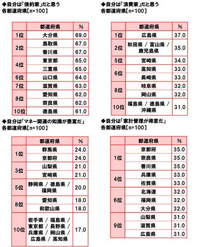 各都道府県民のマネータイプについては、【自分は倹約家だと思う】では1位が「大分県」(69.0%)、2位が「鳥取県」「香川県」(同率67.0%)、【自分は浪費家だと思う】では1位が「広島県」(37.0%)、2位が「秋田県」「富山県」「鹿児島県」(同率35.0%)となっています。