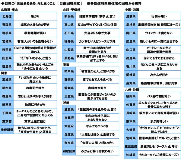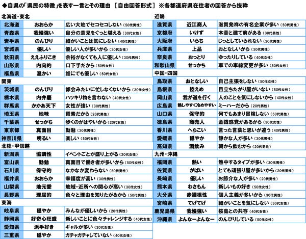自県の「県民の特徴」を表す一言としては、秋田県は「ええふりこき」、群馬県は「かかあ天下」、山梨県は「地元愛」、愛知県は「派手好き」、大阪府は「いらち」、岡山県は「我が道を行く」、広島県は「熱しやすく冷めやすい」、香川県は「へらこい」、高知県は「酒飲み」、福岡県は「熱い」、熊本県は「わさもん」、沖縄県は「よんなーよんなー」などが挙げられています。