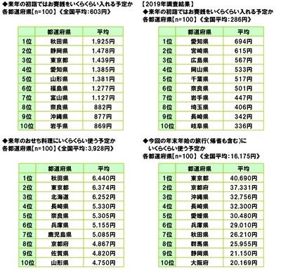 来年のおせち料理の予算の平均額は1位が「秋田県」(6,440円)、2位が「東京都」(6,374円)、3位が「北海道」(6,252円)となり、秋田県は「今年のクリスマス予算」「来年のお賽銭予算」「来年のおせち料理予算」のすべてで1位となっています。