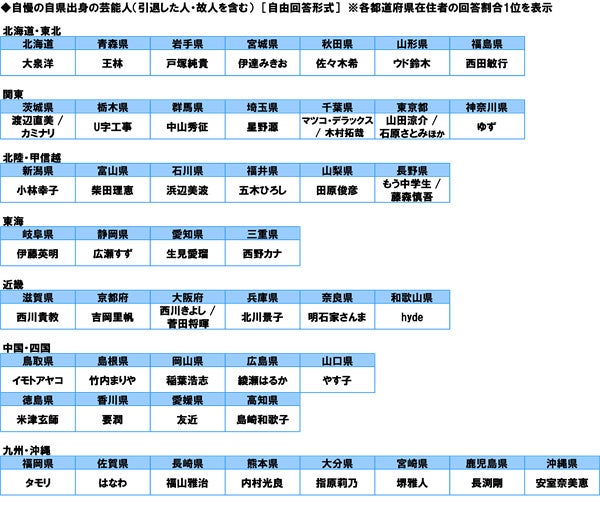 調査では自慢の自県出身の芸能人も挙げられており、岩手県は「戸塚純貴さん」、山形県は「ウド鈴木さん」、福島県は「西田敏行さん」、茨城県は「渡辺直美さん/カミナリ」、埼玉県は「星野源さん」、新潟県は「小林幸子さん」、福井県は「五木ひろしさん」、愛知県は「生見愛瑠さん」、三重県は「西野カナさん」、京都府は「吉岡里帆さん」、和歌山県は「hydeさん」、島根県は「竹内まりやさん」、岡山県は「稲葉浩志さん」、福岡県は「タモリさん」、宮崎県は「堺雅人さん」などが名前を連ねています。
