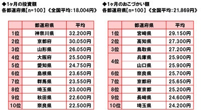 投資額については、1ヶ月の投資額の平均は1位が「神奈川県」(32,200円)、2位が「京都府」(30,050円)、3位が「山形県」(26,050円)となっています。