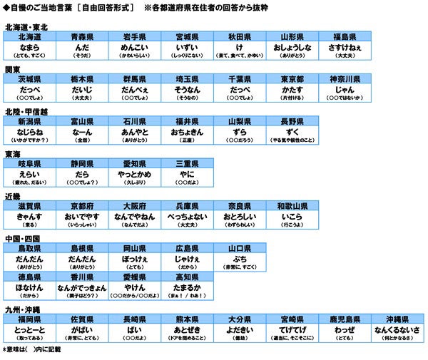 また自県の好きなご当地言葉としては、宮城県の「いずい」、福島県の「さすけねぇ」、埼玉県の「そうなん」、東京都の「かたす」、富山県の「なーん」、静岡県の「だら」、三重県の「やに」、滋賀県の「きゃんす」、奈良県の「おとろしい」、和歌山県の「いこら」、広島県の「じゃけぇ」、愛媛県の「やけん」、高知県の「たまるか」、佐賀県の「がばい」、熊本県の「あとぜき」、宮崎県の「てげてげ」、沖縄県の「なんくるないさ」などが挙げられました。