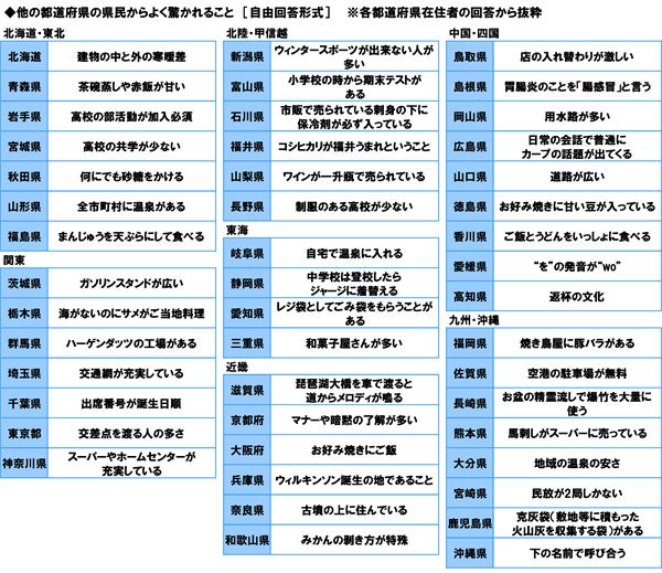 「他の都道府県の県民からよく驚かれること」としては、岩手県の「高校の部活動が加入必須」、山形県の「全市町村に温泉がある」、栃木県の「海がないのにサメがご当地料理」、新潟県の「ウィンタースポーツが出来ない人が多い」、山梨県の「ワインが一升瓶で売られている」、奈良県の「古墳の上に住んでいる」、鳥取県の「店の入れ替わりが激しい」、高知県の「返杯の文化」、長崎県の「お盆の精霊流しで爆竹を大量に使う」、沖縄県の「下の名前で呼び合う」などが挙げられました。