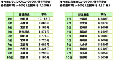 年末年始の出費については、今年のクリスマス(プレゼント代、食事代を含めた総額)の予算の平均額は1位が「秋田県」(10,155円)、2位が「兵庫県」(9,860円)、3位が「東京都」(9,166円)となっています。1位の秋田県では全国平均(7,069円)と比較して3,086円も高い金額となっているそうです。