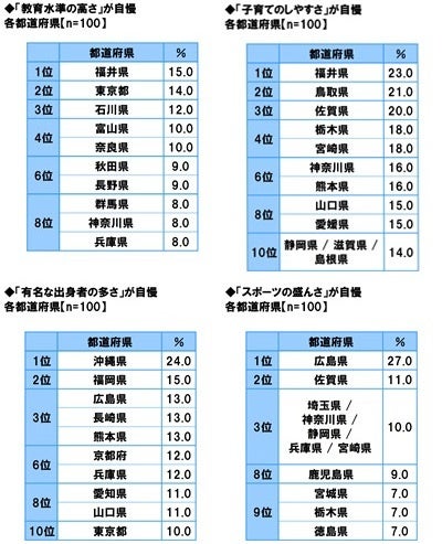 【教育水準の高さ自慢】では、1位が「福井県」(15.0%)、2位が「東京都」(14.0%)、3位が「石川県」(12.0%)となり、福井県は6年連続の1位となっています。
