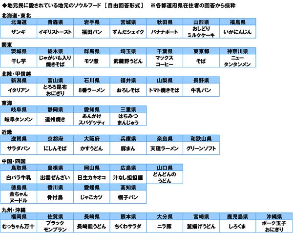 「地元民に愛されている地元のソウルフード」としては、北海道の「ザンギ」、青森県の「イギリストースト」、山形県の「おしどりミルクケーキ」、栃木県の「じゃがいも入り焼きそば」、群馬県の「モツ煮」、新潟県の「イタリアン」、山梨県の「トマト焼きそば」、三重県の「はちみつまんじゅう」、滋賀県の「サラダパン」、広島県の「汁なし担担麺」、愛媛県の「じゃこカツ」、鹿児島県の「しろくま」、沖縄県の「ポーク玉子おにぎり」などが挙げられています。