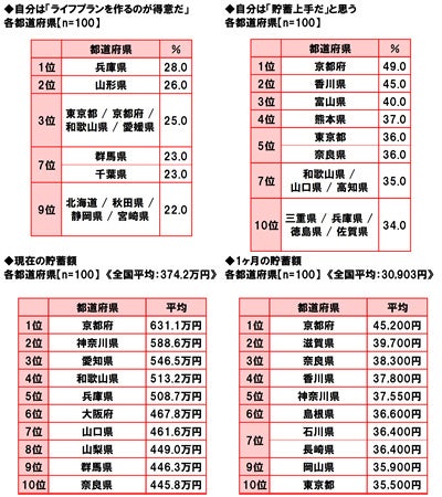 【自分はライフプランを作るのが得意だ】では、1位は「兵庫県」(28.0%)、2位は「山形県」(26.0%)、3位は「東京都」「京都府」「和歌山県」「愛媛県」(同率25.0%)でした。