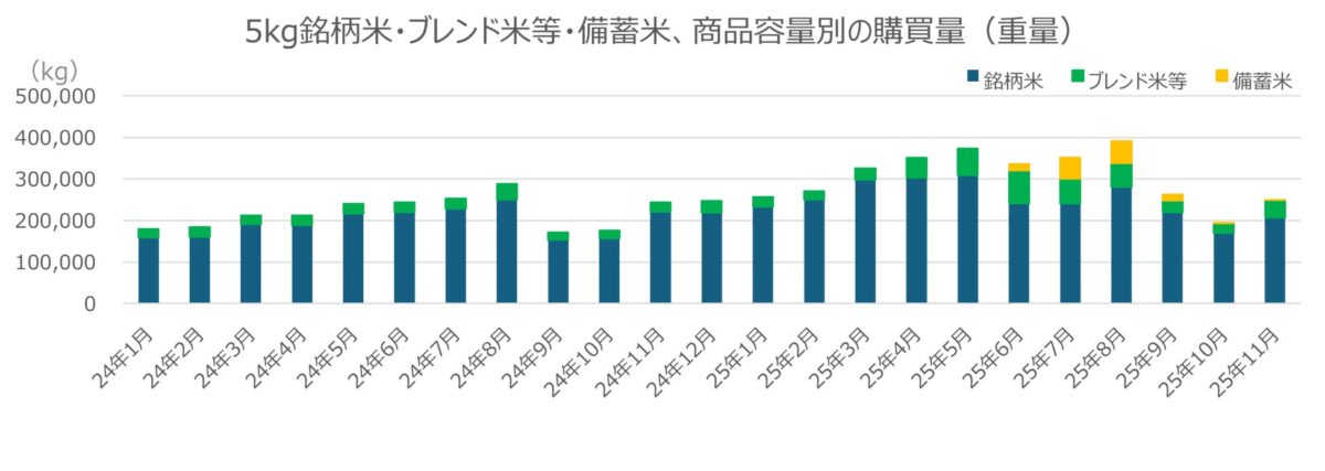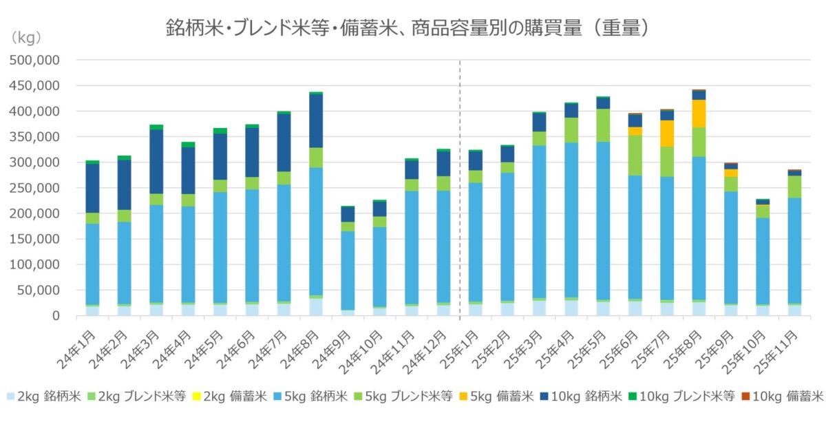 また、ブレンド米等においても容量は5kgが中心となる傾向が見られました。特筆すべき点として、備蓄米の放出が行われた2025年4月以降は、5kg商品が購買総量を下支えし、市場の平準化に貢献したことが挙げられます。このことから、5kg容量は価格上昇が続く中での家計調整の受け皿として機能していると考えられます。