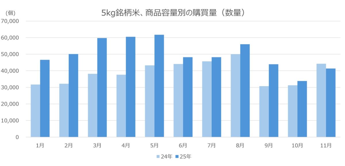 5kg銘柄米に焦点を当てると、2024年と比較して11月を除くすべての月において購買量(数量)が前年を上回る結果となりました。この現象について東芝デジタルソリューションズ株式会社は、10kg商品の取り扱いが限定的になったことで消費者の選択肢が狭まり、その結果として5kg容量を選ぶ層が一定程度存在した可能性があると分析しています。