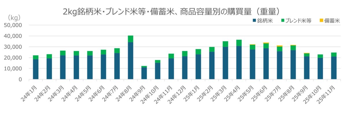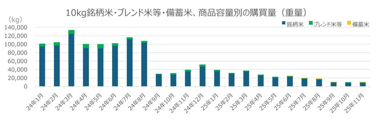 容量別の分析では、銘柄米の2kgが2024年上期から夏にかけて増加し、新米期にも一定の需要を維持していることが確認されました。この傾向から、価格上昇局面において「容量を減らしてこまめに購入する」といった消費者行動が広がっていることが容量別グラフからも読み取れます。一方、銘柄米の10kgは2024年秋以降、明確な縮小傾向を示し、2025年中盤以降はさらに減少して極めて少ない水準にまで落ち込んでいます。