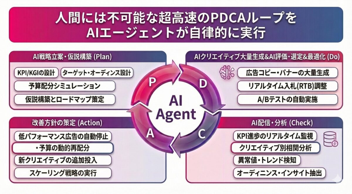 戦略の策定から入札の調整、クリエイティブの差し替えに至るまで、AIエージェントが人間に代わってすべての実務プロセスを自律的に完結させます。