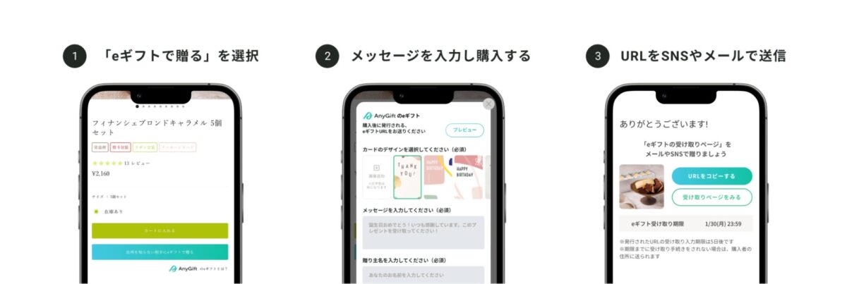 3)購入完了後、eギフトの受け取りURLが発行されます。LINEなどの各種SNSやメールでURLを伝えることで、eギフトを贈ることができます。