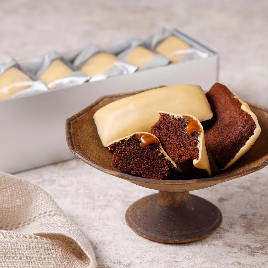 素材にこだわり、リッチでしっとりとした濃厚な生地にはチョコレートをたっぷりと加え、まろやかな塩キャラメルを忍ばせています。天面はブロンドチョコレートでコーティングされており、香ばしさとキャラメルのコクが溶け合う至福の口どけが特徴です。