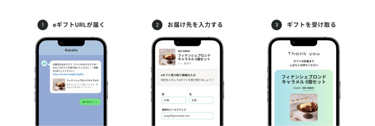 AnyGiftは、贈る相手の住所が分からない場合でも、LINEやメールを通じて贈ることが可能な「eギフト機能」をECサイトに実装できるサービスとなっています。