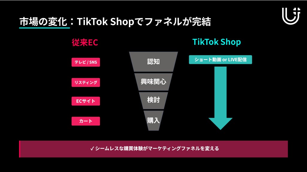 こうした経験を通じて強く感じたのが、「プラットフォームの構造を理解しないまま、表面的な運用をしても、コンテンツコマースは成果に繋がらない」という課題だと述べています。TikTok Shopは、単なる新しいECチャネルではなく、コンテンツそのものが価値となり、購買行動を自然に生み出す新しい商流です。その本質を理解し、正しく設計すれば、大きな可能性を秘めているとしています。