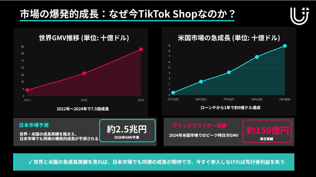このシームレスな購買体験を背景として、TikTok Shopの世界GMVは2022年から2024年にかけて約7.5倍の成長を遂げているとのことです。米国市場においてはローンチから1年間で約9億ドル規模に到達し、2024年のブラックフライデーでは単日のGMVが約150億円を記録しました。これらの実績を踏まえると、日本市場においても2028年には約2.5兆円規模に達すると予測されており、現在まさに参入の好機が訪れていると言えます。