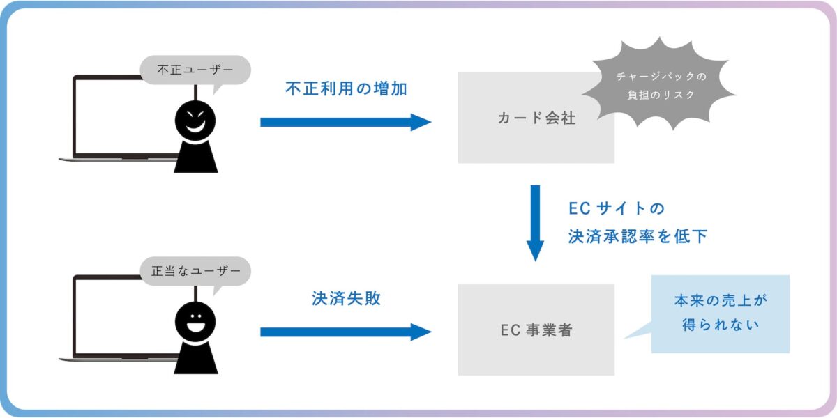 ECサイトで発生するクレジットカードの不正利用は、消費者に対する直接的な被害や企業の信頼性低下をもたらすだけではありません。売上に直結する「クレジットカードの決済承認率」にも重大な影響を与えるとのことです。