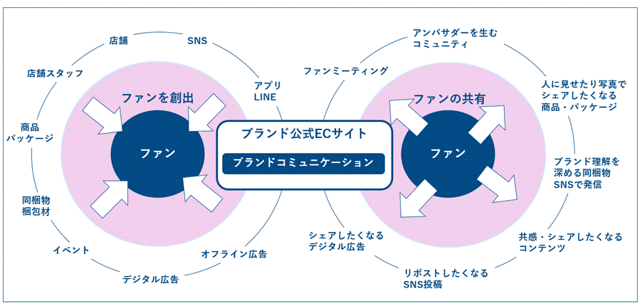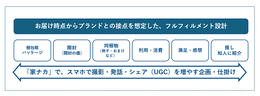 この「売る場」であることには変わりはないですが、ECの大きな特徴は、企業が持つブランドや商品が、サイトで購入した後に購入者の元へ直接「商品が届き、開封、利用・体感を開始する」点にあります。この購買後の体験までを含めて、ECサイトや購入体験、購入後の関係性維持を設計することで、ECは「ブランドコミュニケーションの場」へと位置づけが変わっていきます。