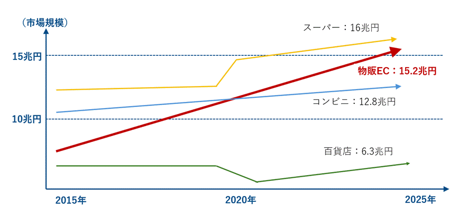 一方で物販EC市場規模は15兆円を超え、すでに社会インフラとなっているスーパーやコンビニと同等に日常的に利用される市場規模となり、日々の生活を支える存在になっています。身近な例では、インターネットやスマートフォンが「あると便利。必要なときに利用する。」から「ないと困る。生活を豊かにする。」存在へ変化したのに近い状況です。