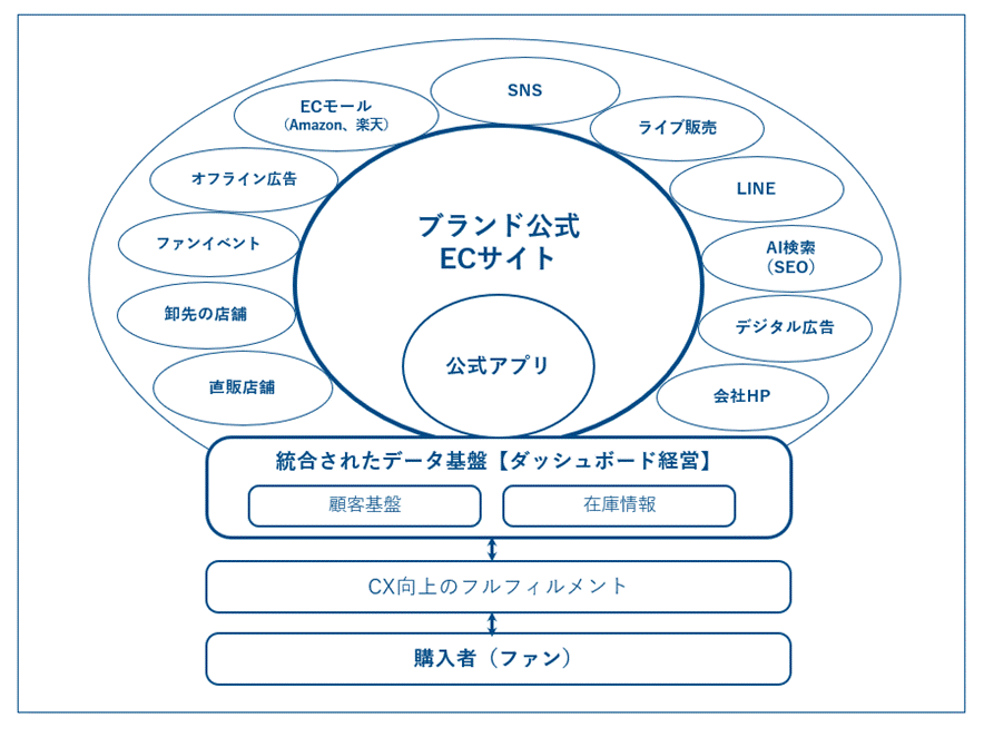 今後もチャネル拡大を進める流れは続きますが、各企業が自社でAI活用が日常化することも踏まえて、顧客データやマーケティングデータを自社で保有・蓄積し、多様化する顧客接点を捉えて継続的な関係性を維持し「ブランドロイヤリティ」を高める活動が重要になります。そのため「公式オンラインショップ=ブランド公式ECサイトを中心とした」運営が主流になると予測します。
