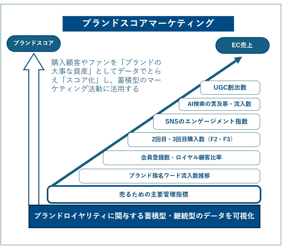 主な指標例としては「ブランド指名ワード流入数の推移」「AI検索からの流入数」「主要ページ滞在時間」「ページ閲覧数」「2回目・3回目購入率(F2・F3)」「UGC創出数」「SNSのエンゲージメント指数」などがあり、これらを「ブランド資産=ブランドスコア」と位置づけて蓄積し、ファン化の進捗をデータや指標で捉えつつ施策を実行することが重要となると予測します。